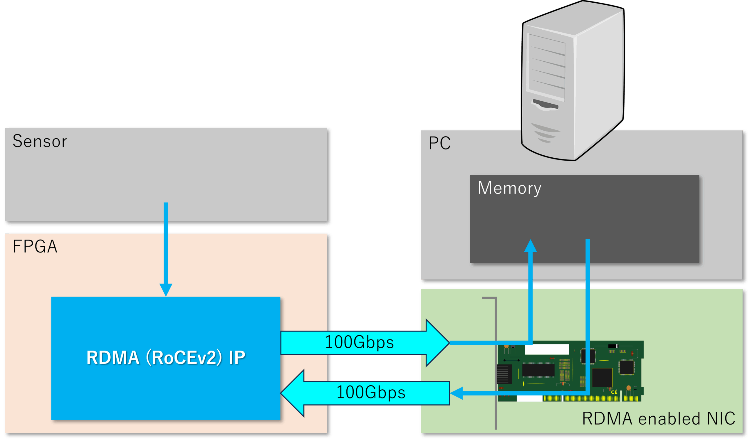 Our RDMA IP for I/O nodes is an IP that enables transfers outputs from sensors and other devices using the RDMA (RoCEv2) protocol entirely without CPU involvement. By carrying data on the RDMA protocol, data can be sent and received without placing load on the CPU of the connected PC. This enables the systems for collecting high-bandwidth sensor data and transferring video data with low latency.
