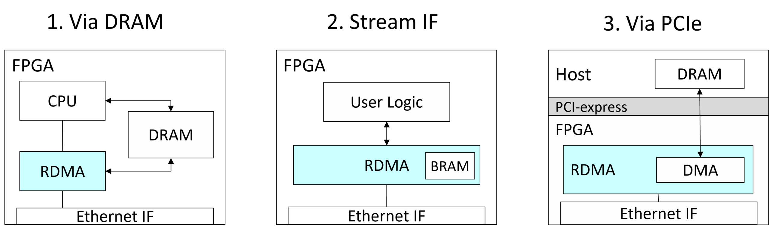 The DRAM-based interface achieves RDMA by placing all target data onto DRAM connected via bus to the FPGA and issuing commands to the IP.