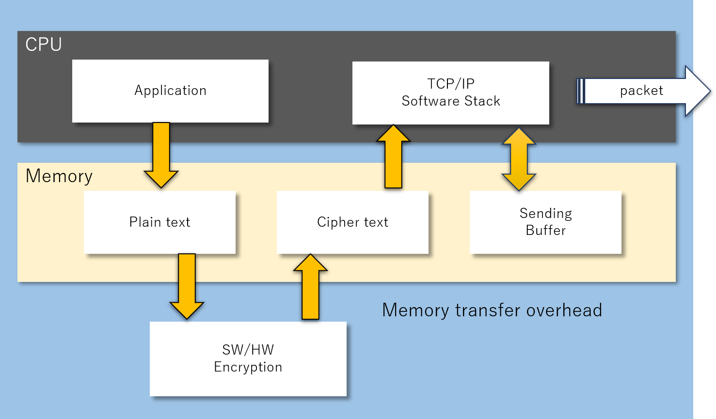 Even where using dedicated hardware for encryption, the TCP/IP protocol is typically implemented in software, resulting in memory transfers before and after encryption (left diagram).